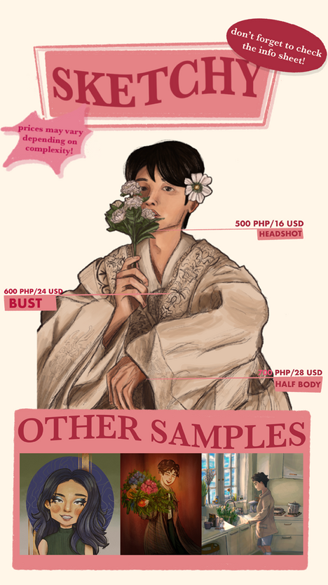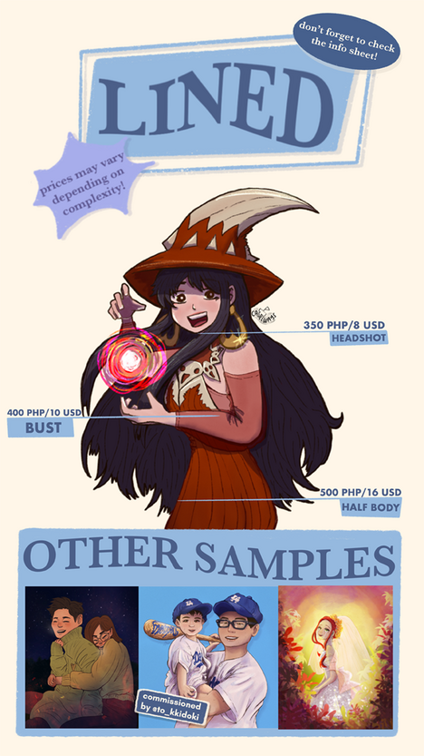 • Please provide clear references for a more accurate commission.Clear references may include but are not limited to a mood board/collage, color palettes, stick figure drawings, and sample artworks. Note that the artist will draw art in their own styles.•The artist has the right to decline or stop any commission AT ANY TIME FOR ANY REASON.• All artworks and commissions created will be credited to the artist as the sole creator. You are NOT ALLOWED to claim the commission as your own creation.• Commissions will be drawn in my art style. Please DO NOT ask me to draw in another artist's art style.• Commissions are only for PERSONAL USE.You are NOT ALLOWED TO SELL OR USE your commissions as advertisements, prints, merchandise, logos, and the like to any third party. If you intend to use it commercially, please email [email protected] .• The commissioned piece may be posted on my social media accounts and portfolios with your consent. Do let the artist know if you want to keep the piece private.• You are allowed to make 1-3 MINOR REVISIONS in the sketch phase. Any revisions afterward may be entertained depending on how plausible the revision is and at what stage of the commission is the revision requested. If the revision is not possible, it will not be entertained.• All paid and sent commissions are final. REFUNDS ARE NOT ALLOWED ONCE THE COMMISSION IS FINISHED AND SENT. Refunds may be granted if the artist cannot fulfill the commission any further or the client can no longer fund the commission.• Commissions will take around A WEEK TO A MONTH to complete depending on the complexity of the commission and the availability of the artist. You will be notified via your preferred communication channel (email, Twitter/Instagram DMs, discord commission server) if there will be any delays or changes to the timeline. Please check the queue as well.