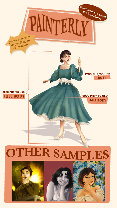 • Before requesting a commission, it is understood that you have read the terms and conditions beforehand. A confirmation message will be sent before requesting payment.•PLEASE PAY IN FULL BEFORE THE COMMISSION START.If you cannot pay in full but want to commission, you may pay a 50% downpayment before starting the commission. You must deliver the remaining balance when once the first draft (sketch + base colors) is sent. The commission will not progress further if the remaining balance is not paid. You may get a quotation before requesting a commission.